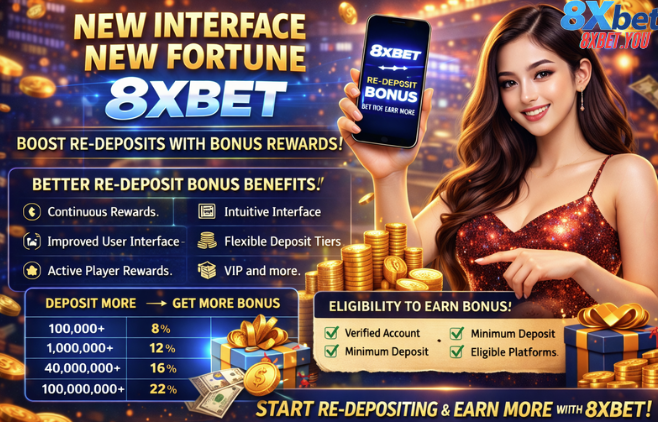The New Interface New Fortune 8xbet – Re-Deposit Bonus is designed to enhance player engagement by rewarding returning users who continue funding their accounts. This updated promotion combines a refreshed platform experience with structured bonus incentives, making the overall journey on 8xbet through the link 8xbet mới 2026 more dynamic, interactive, and rewarding.